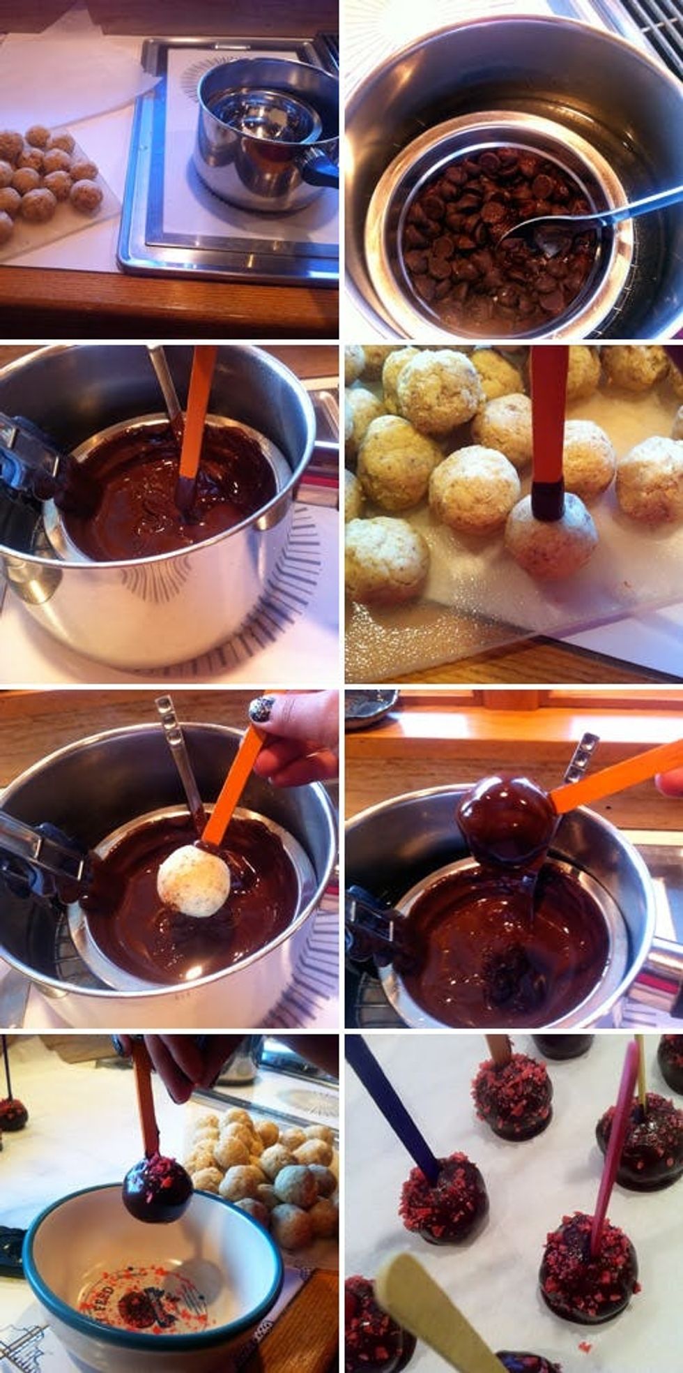 First, dip the tip of the stick in the melted chocolate, then stick that end into the cake ball. Then dip the whole pop into the melted chocolate (use a spoon to drip chocolate over the top if your bowl isn’t quite deep enough).