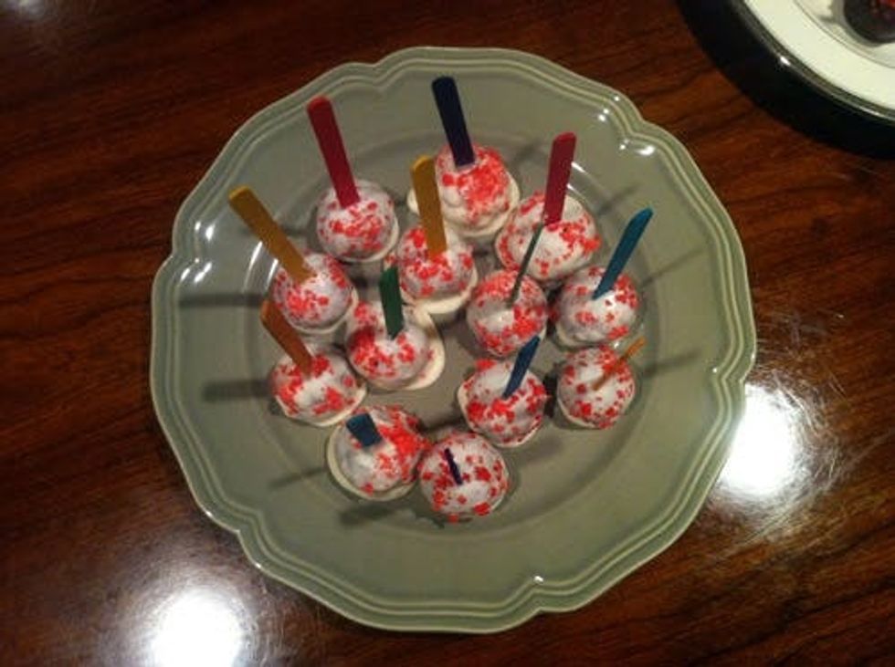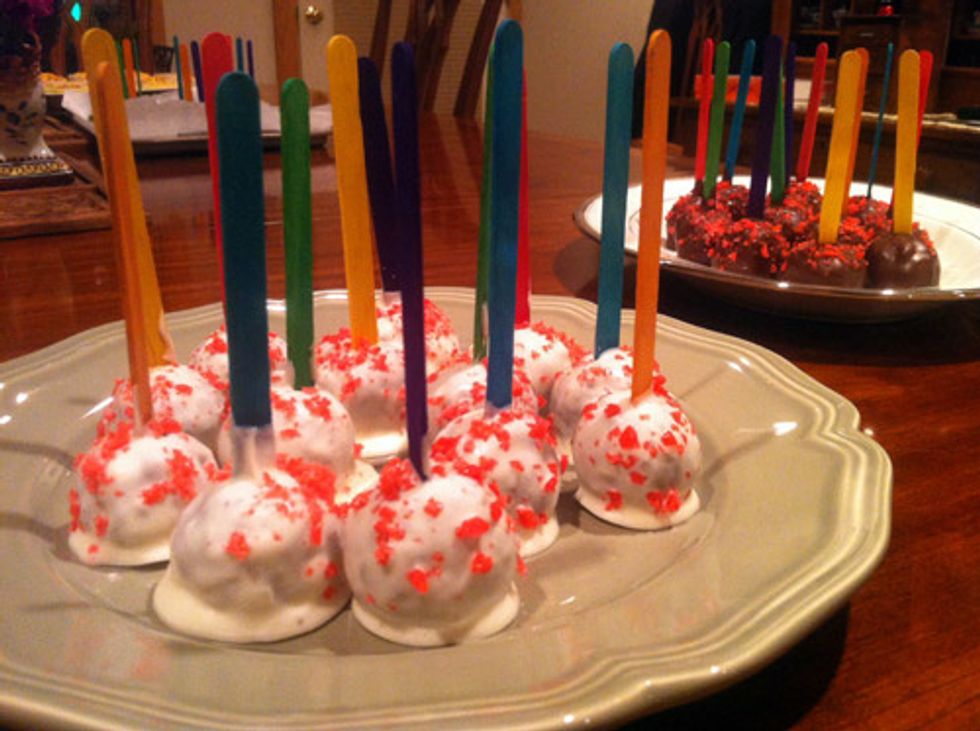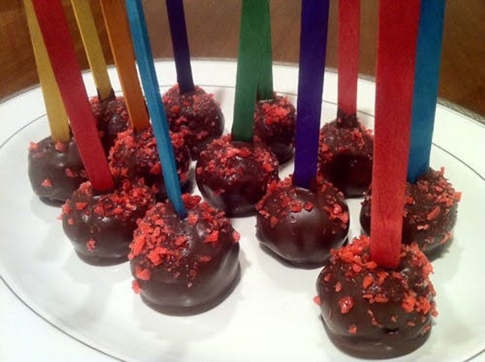 Once you have a nice bowl of melted chocolate, get your cake pops ready. For the sticks, we used multicolored craft popsicle sticks, but lollipop sticks or dowels also work.