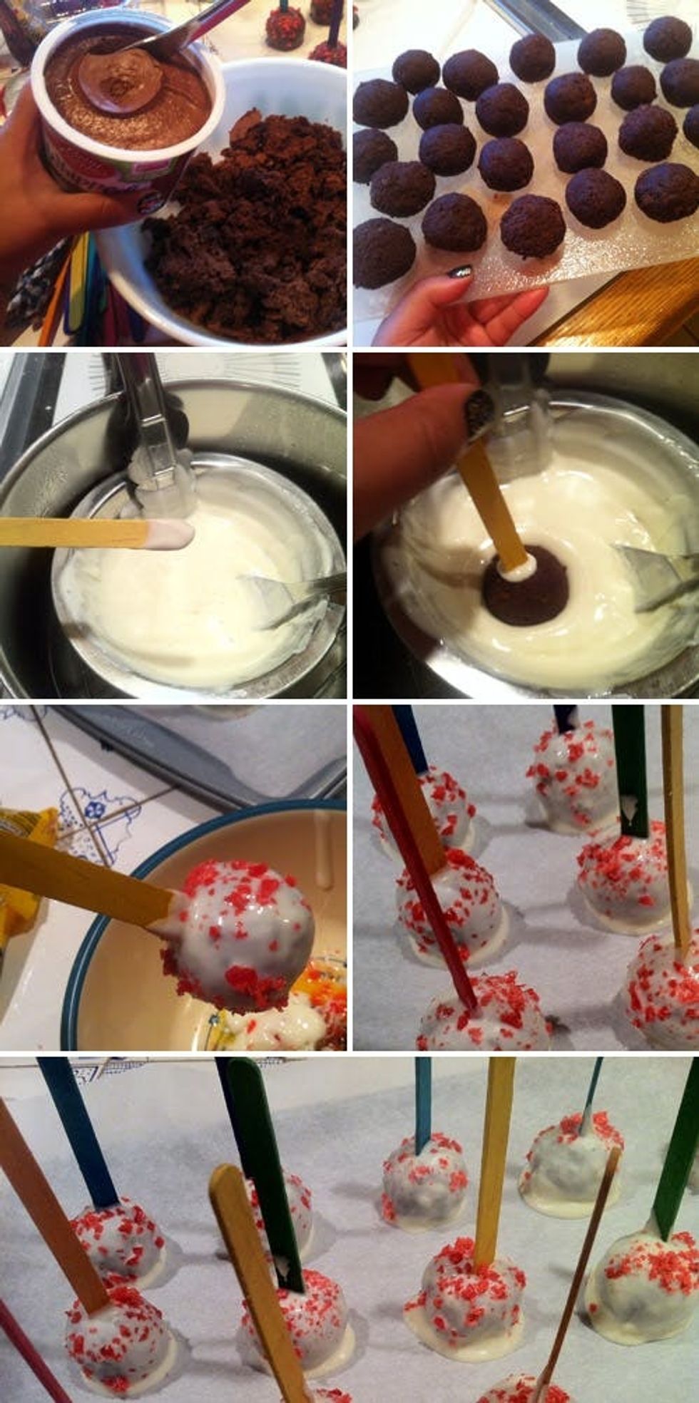 Repeat the same process with the brownie mix, but use about one third of a frosting can and add extra as needed based on consistency. One box of brownie mix will yield about 25 pops.