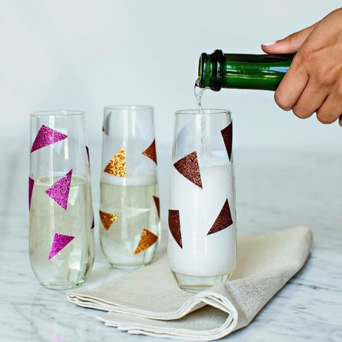 3. Embellished Glitter Decals: This awesome hack will look like you spent hours painstakingly etching your gorgeous glasses. They’ll never guess that your secret is glitter tape. (via HGTV)