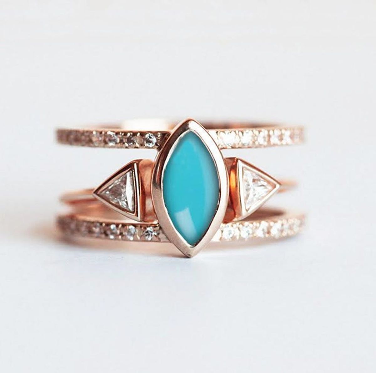1. Turquoise Diamond Ring ($1,850): This is the ring for lovers of bright colors and intricate designs. Everything from the shapes to the choice of center stone is unique and super gorgeous.