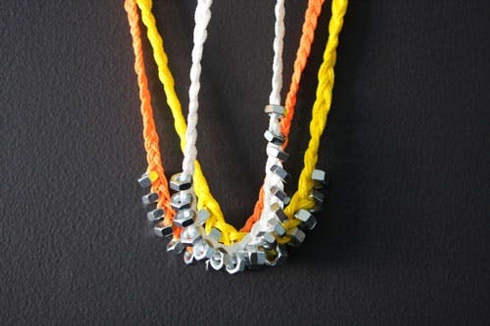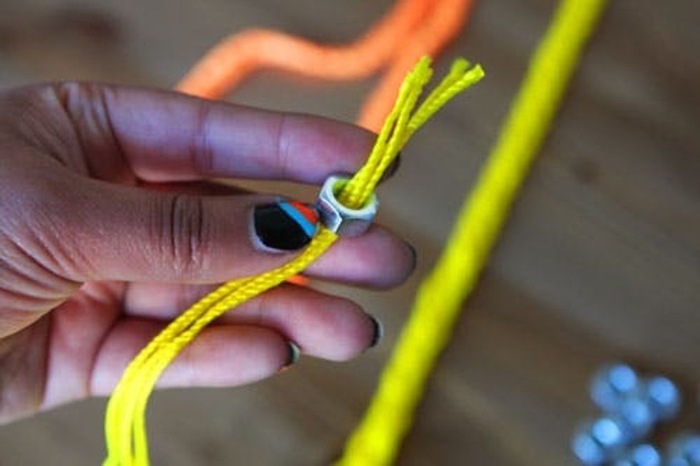 Your project begins at your local hardware store. In our case, we headed to Robert's on Haight Street. The nuts and bolts aisle is basically your new favorite bead store. Grab a handful of colorful nylon twine, and be on your way.