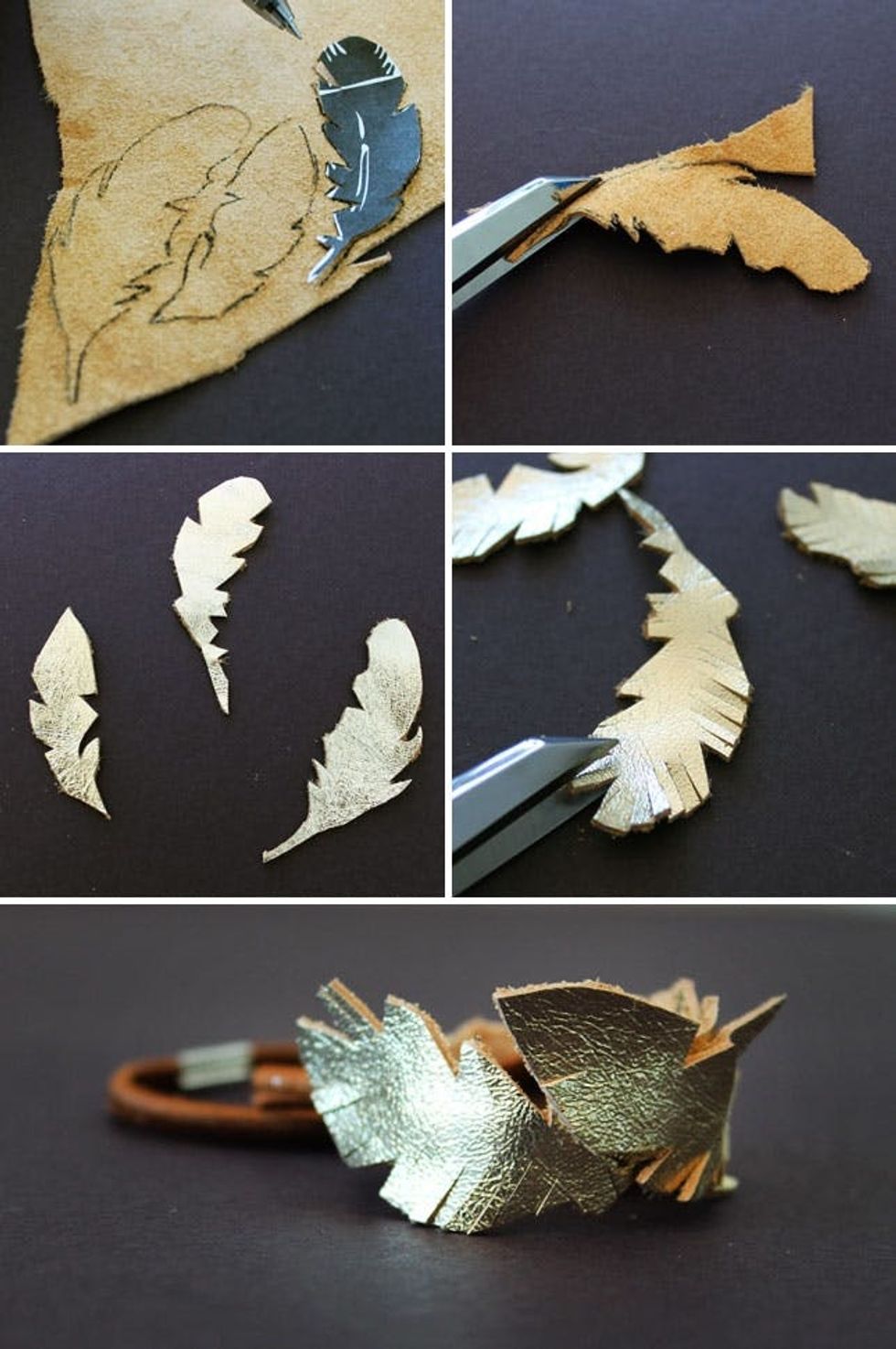 Trace feathers on the backside of the leather and cut. Use scissors to cut small slits and “feather” things up a little bit more. As with the stars, simply use hot glue to attach and you’re done.