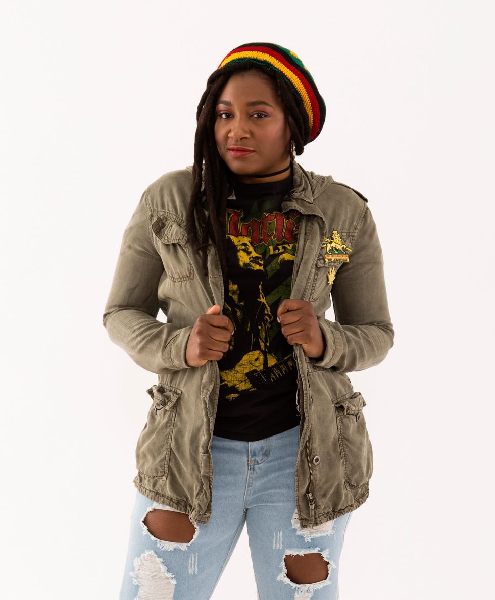 Nine Ball: Rihanna definitely makes being a hacker genius look fun with her carefree, rasta-inspired vibe. Copy her laid-back look with a pair of light blue distressed jeans ($33), an olive green jacket ($35), and a rasta beanie with dreads included ($16). Be sure to add some Jamaican flair with a Lion of Judah patch ($7) and a ganja leaf pin ($7).