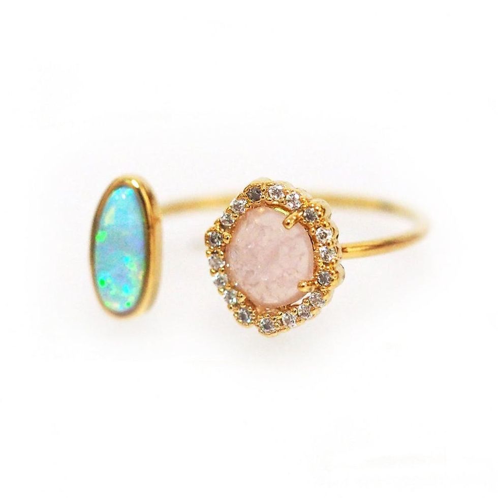 3. TAI Adjustable Gold Ring With Opal Stone and Rose Crystal ($75): *Jaw drops.* Black tie affairs and classy cocktail parties call for this cubic zirconia-encrusted ring featuring a glistening opal and rose crystal stone.
