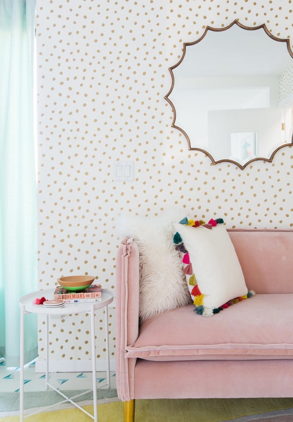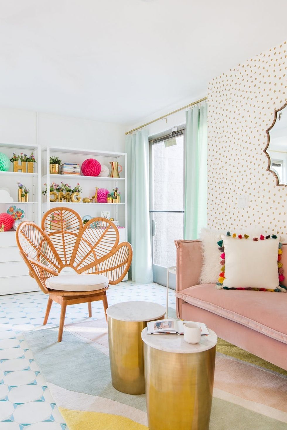 To encounter Joy Cho’s joyful aesthetic is to love it. Whether you were first introduced to the mind behind Oh Joy! via her numerous Target collabs, or you’ve been a fan of this multi-hyphenate from the beginning, it’s hard to resist her unique talent for pairing bright pops of color with playful patterns. It’s no surprise, then, that Cho’s personal office is a perfectly on-point mix of polka dots, plush textures, metallic accents, and candy-colored hues. Designer Sarah Sherman Samuel (who’s working on making Mandy Moore’s mid century home into a true stunner as we speak) took Cho’s office from blank slate to a space worthy of such an influential creative mind.