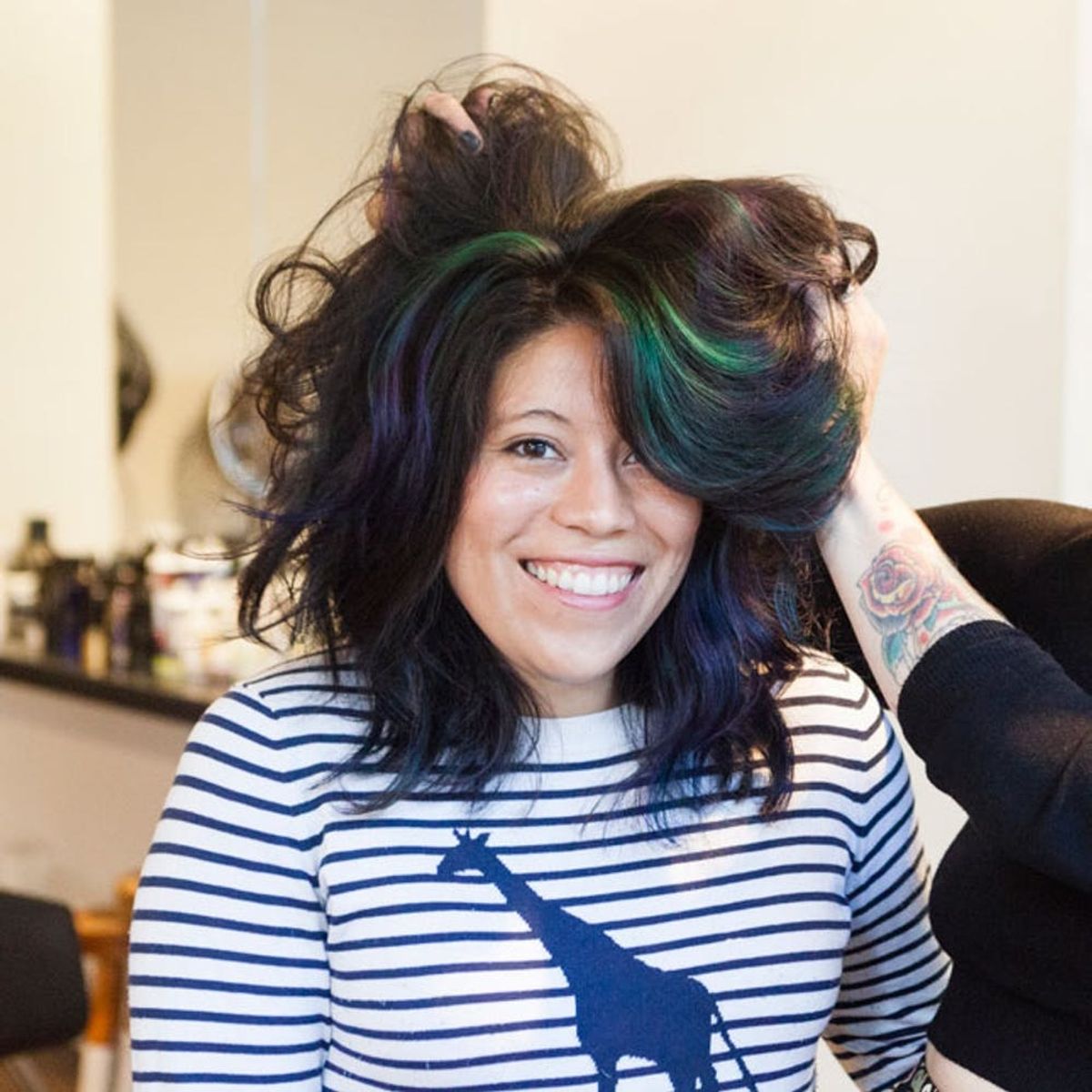 Thanks to the color layering and several dimensions of bleach, my hair was both wild and subtle, all at the same time. With just a casual hair flip, I could tease a few glimpses of teal or purple, but since the colors were limited to near the front of my hair, it wasn’t a full-on assault of color. Shelly said that the maintenance for oil slick hair is easier than pastel hair, since pastel tones fall out of hair so quickly. The only potential downside is that when you’re touching up your oil slick strands, the color blending can pick up randomly. That means every appointment will result in a slightly new color blend.