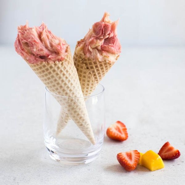 3. Add a small amount of the buttercream inside each ice cream cone. Roughly chop the mango and strawberries (leaving four large strawberries whole), and fill each cone with the chopped fruit. Top each cone with an upturned strawberry, making sure it’s secure (hold it in with another dab of buttercream if you need to).