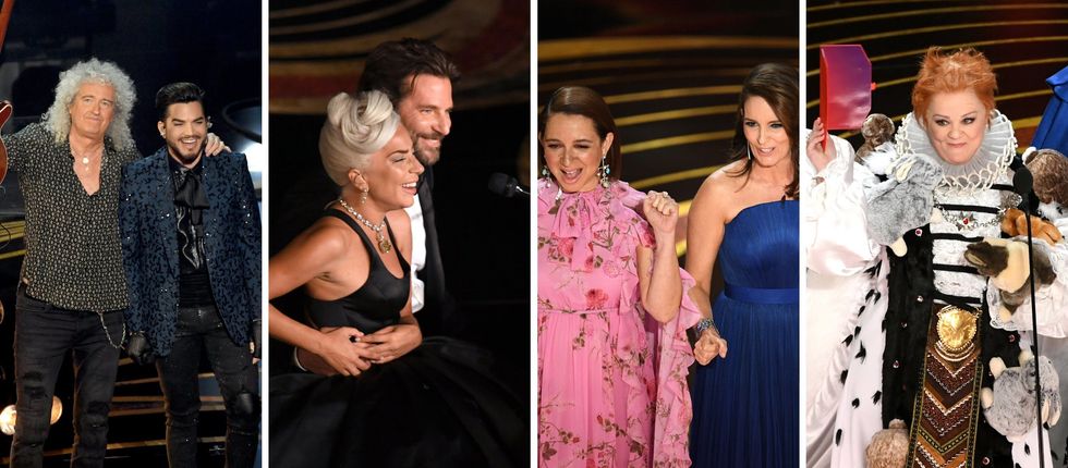 Adam Lambert kicked off the ceremony with members of Queen. Who needs a host with an opener like this? Lambert teamed up with Queen musicians Brian May and Roger Taylor for an electrifying performance of "We Will Rock You" and "We Are the Champions," which can be heard in the Freddie Mercury biopic (and Best Picture nominee) Bohemian Rhapsody. And true to their word, they did, indeed, rock us. (Photo via Kevin Winter/Getty Images)