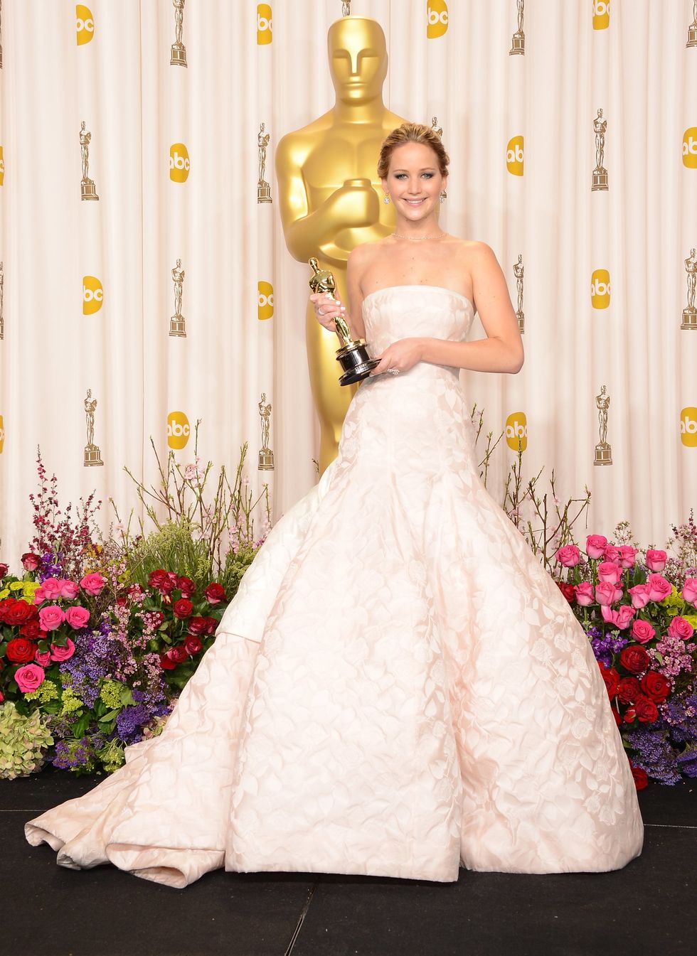 Jennifer Lawrence, 2013: Two years after receiving her first Oscar nomination (for Winter's Bone), Lawrence took home a trophy for her work in the David O. Russell romantic dramedy Silver Linings Playbook, which costarred Bradley Cooper. (Photo via Jason Merritt/Getty Images)