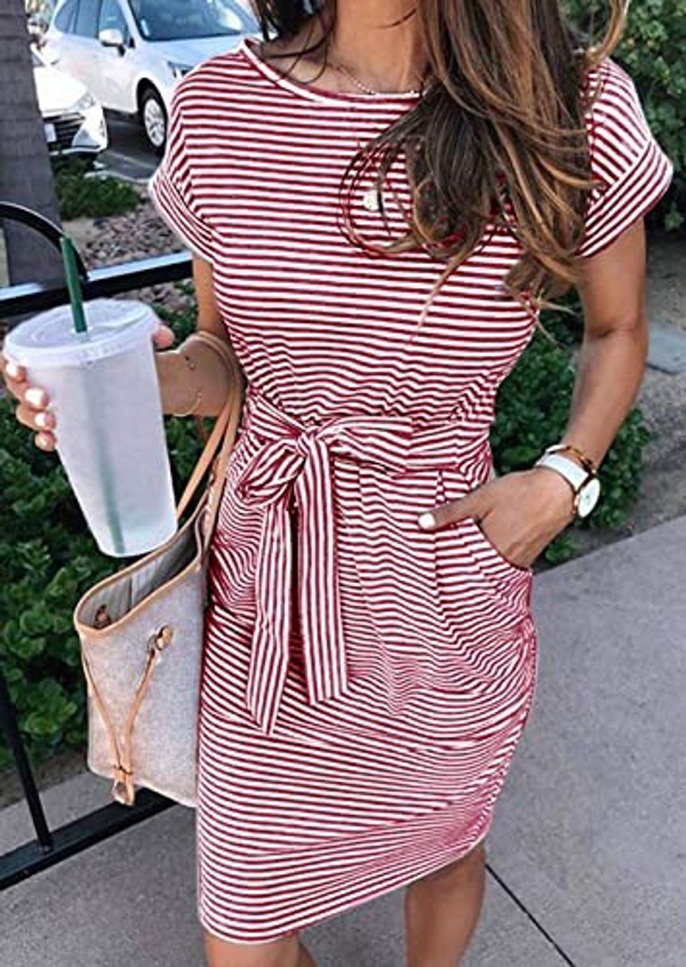 Stay stylish and comfortable with this casual striped t-shirt dress. Its tie waist and pockets add a flattering, laid-back vibe, perfect for summer days. This dress is ideal for anyone wanting a versatile, easy-to-wear outfit.
