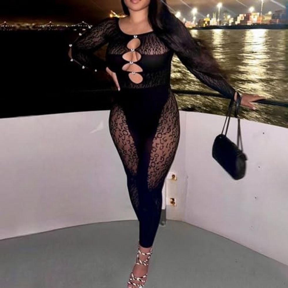 A festival is a place to let loose. If you're looking to party all day and all night long, you're going to need this long sleeve bodycon romper. Make a serious statement in this sheer black lace animal print one piece that will have you looking fierce and feeling fine.