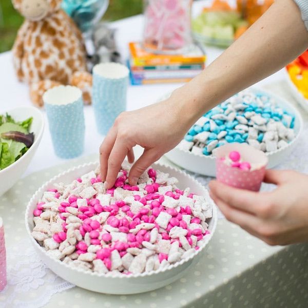 3. Pastel Muddy Buddies: For dessert, serve pink or blue Chex™ Muddy Buddies. The combination of Chex™ cereal, peanut butter, powdered sugar and pink or blue candies are an adorable and mouth-watering treat for your guests to enjoy.