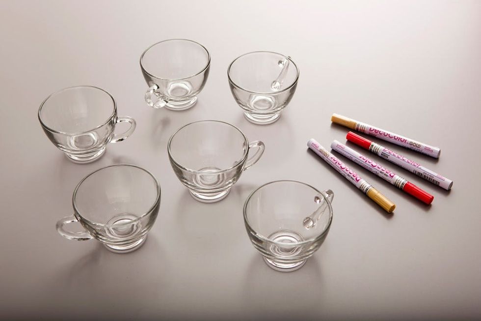 Clear cups? Why yes! These actually came along with a punch bowl, but we don’t recommend using paint pens on larger dishes like that. The key here is keeping your design on the bottom half of the cup, so you don’t run the risk of getting any excess paint inside the cup. Also to note, these cups will last as long as you hand wash them but won’t make it through the dishwasher.