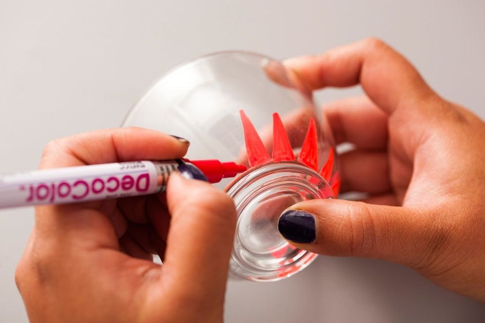 Paint Pen Pro Tip: We experimented a bit on an extra glass and found that opaque paint pens in solid colors work directly on the glass, but metallic ones bubble up.