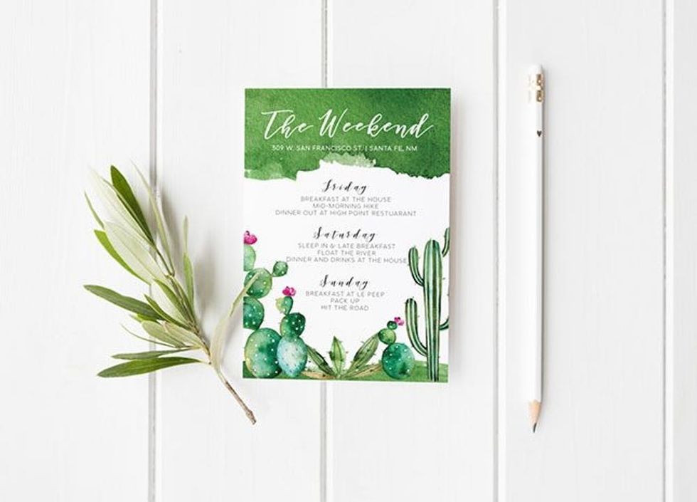 10. Put together a cacti-filled itinerary. Keep with your theme throughout the whole weekend and hand out this desert-themed primprettyprints Bachelorette Weekend Itinerary ($13) before the shenanigans begin. This way everyone will know what to expect, and it should help your girls create a budget if needed.