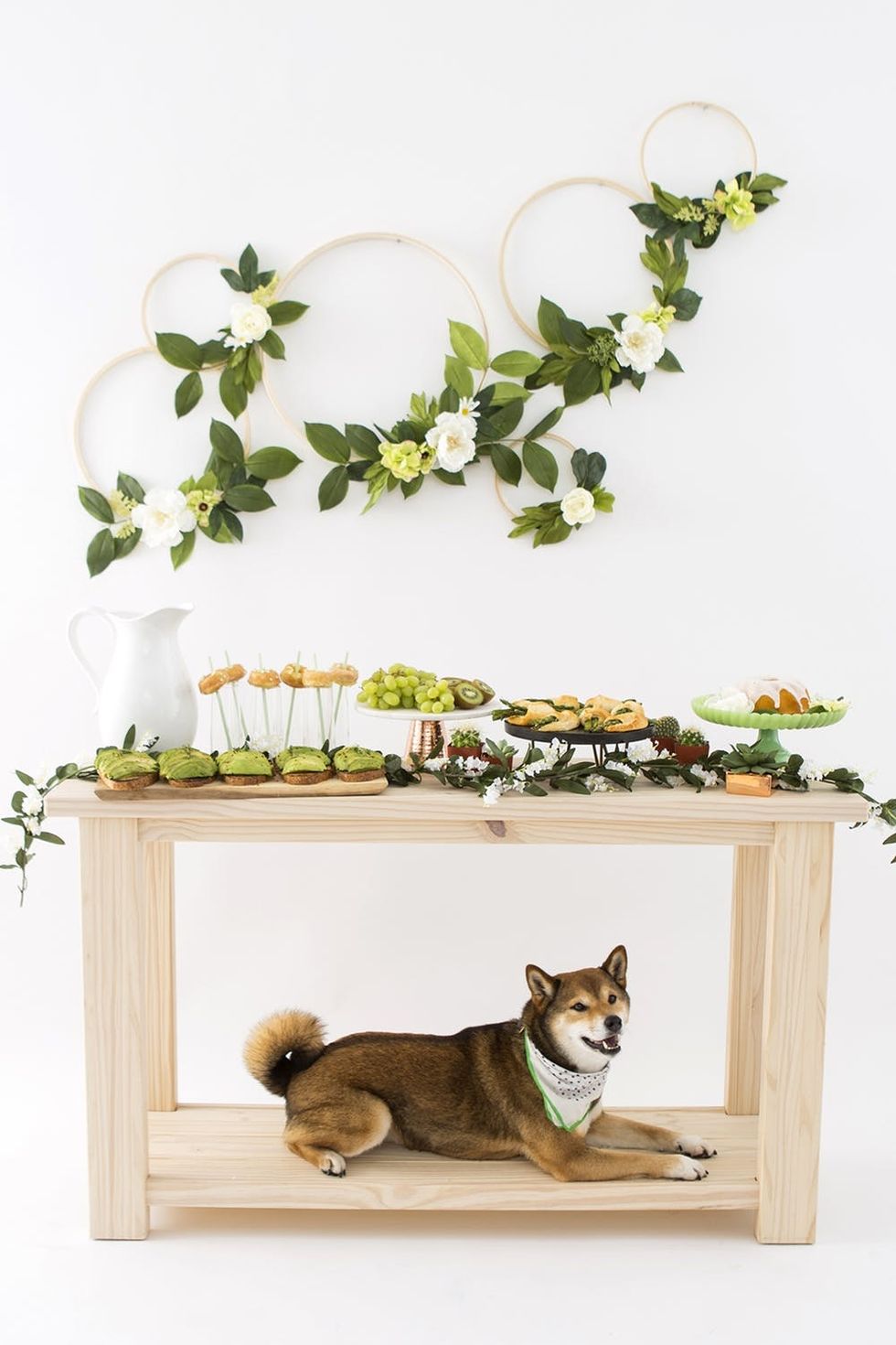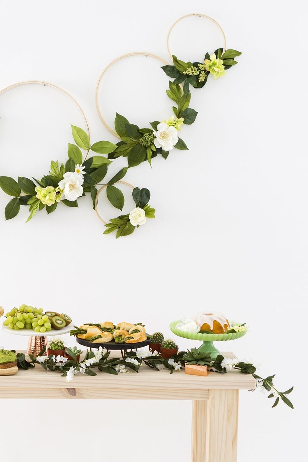 To frame your party, arrange spring wreaths to hang over your table. We just bought embroidery hoops in different sizes and glued a few branches and flowers along a third or fourth of the hoop.