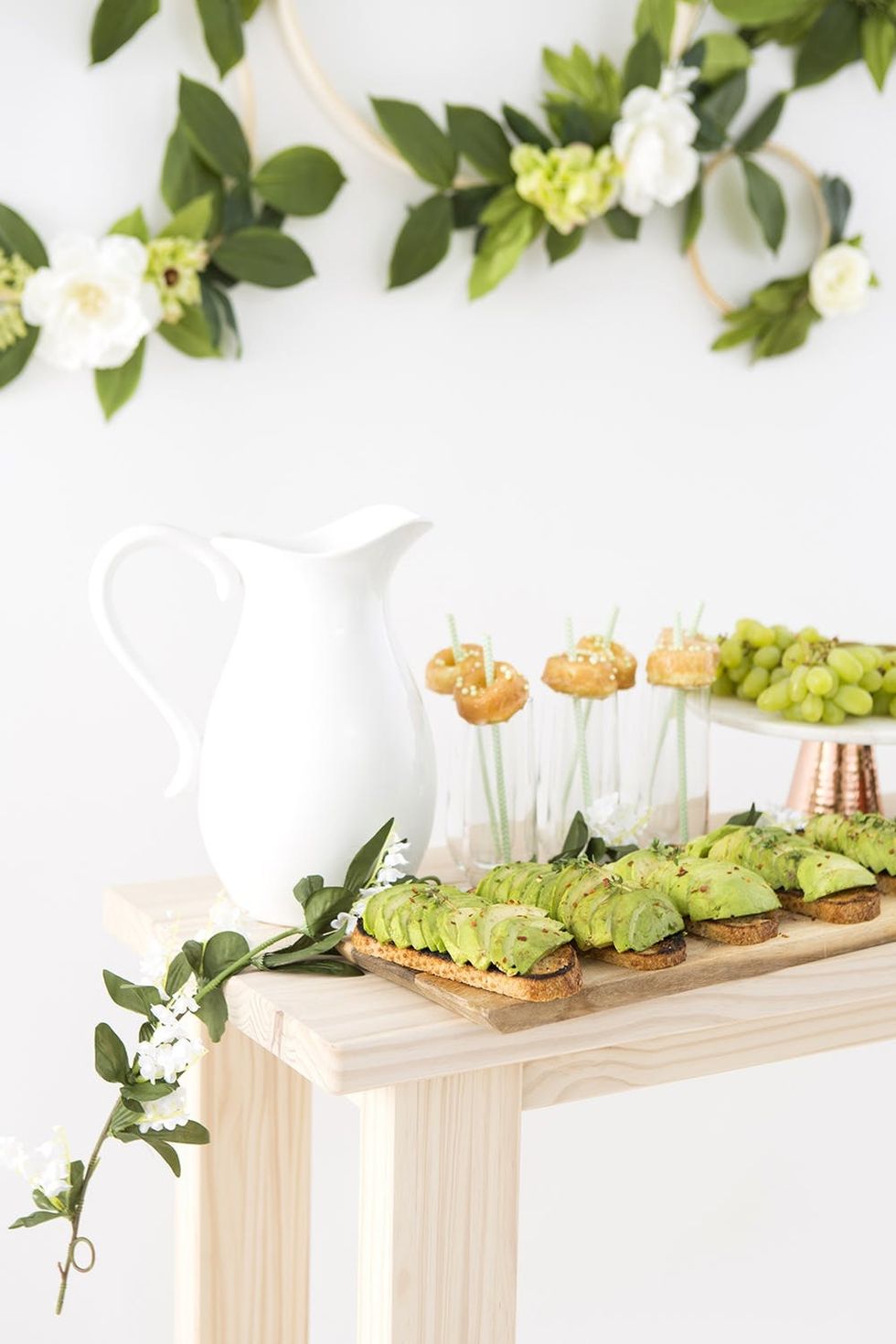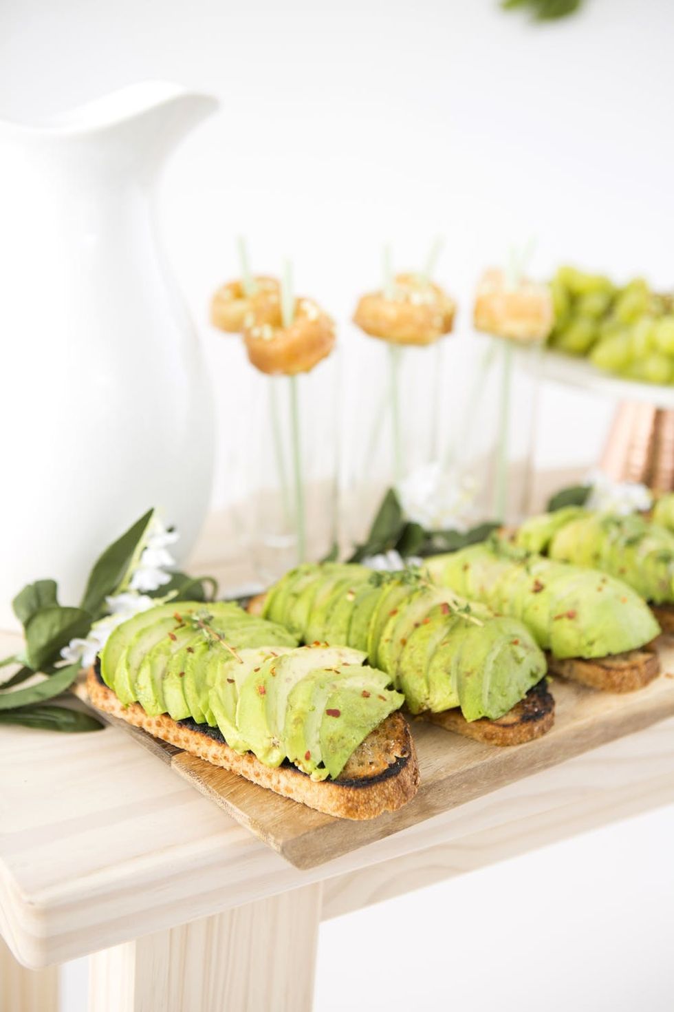 Avocado toast is an absolute must for any brunch, especially one centered around the color Greenery. Toast whole wheat sourdough bread, then load ’em up with sliced avocados. Finish with a sprinkle of chili flakes. Avo-toast, here I come.