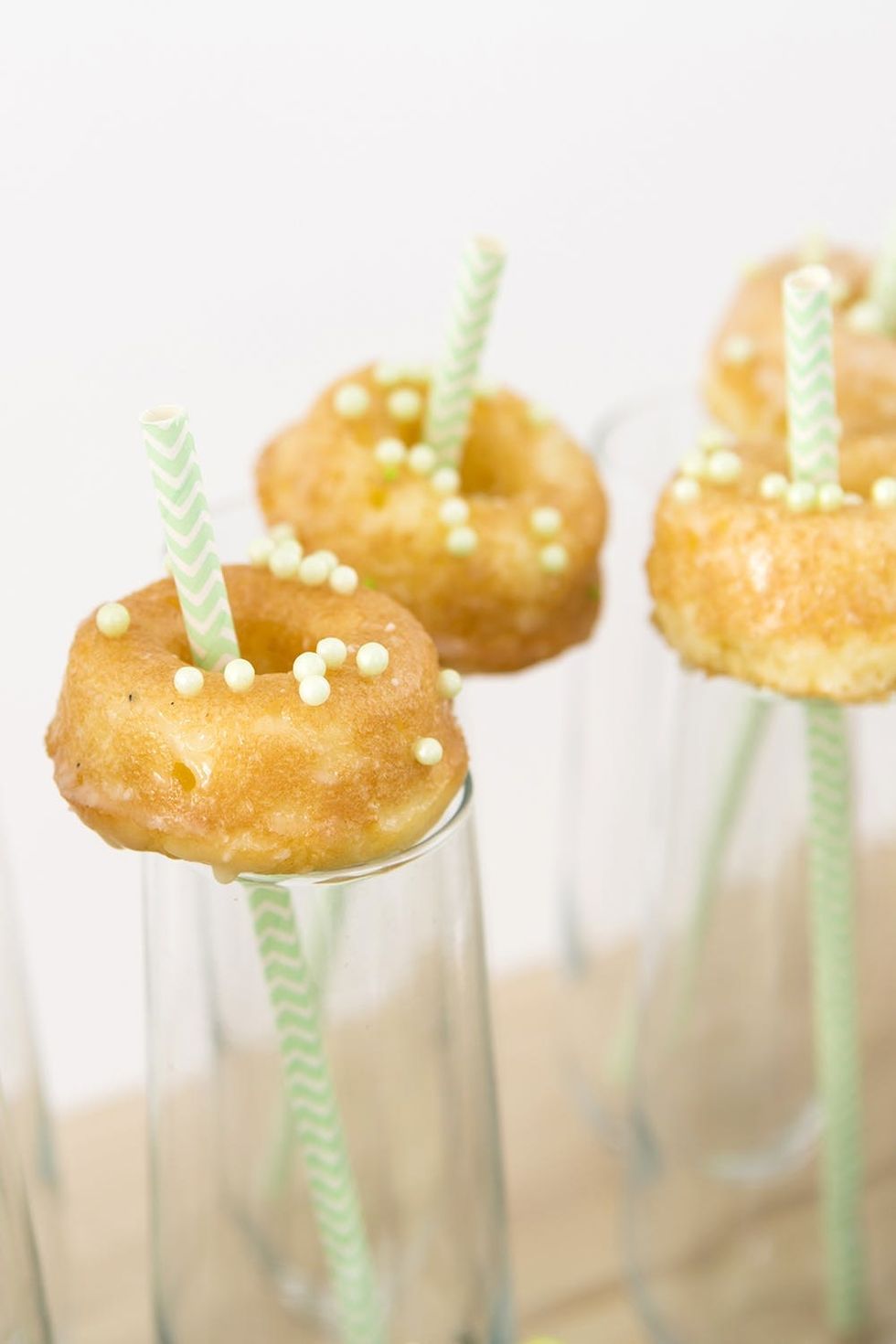 How adorable are these mini donuts? I made these guys out of vanilla cake mix, but omitted the water when mixing everything together. I baked them in a mini donut pan for about 15-20 minutes at 350 degrees, and then dipped them in a white chocolate glaze made out of melted white chocolate chips and some heavy cream. We stuck straws through the middles and stood them on glasses for people to have a little treat while they sipped on drinks.