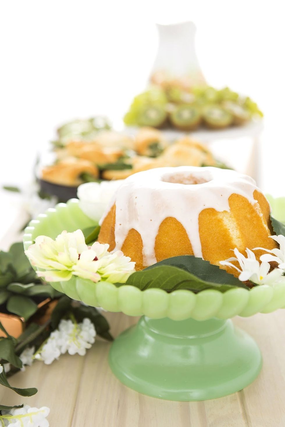 Okay, we know this lemon cake isn’t green, but not a lot of cakes are! Line a cake with blooms and leaves to keep it consistent with the rest of your spread.