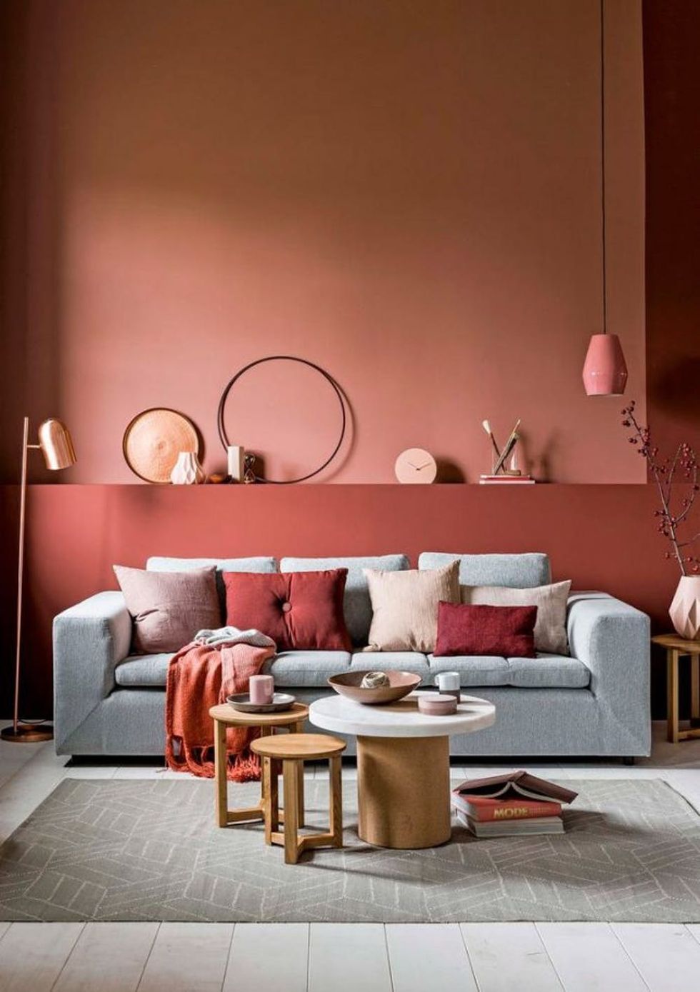 1. Autumn Hues: Up the cool factor in a big way by mixing rust-colored velvet furniture with plum walls. And don’t forget touches of greenery. (via Neptune)