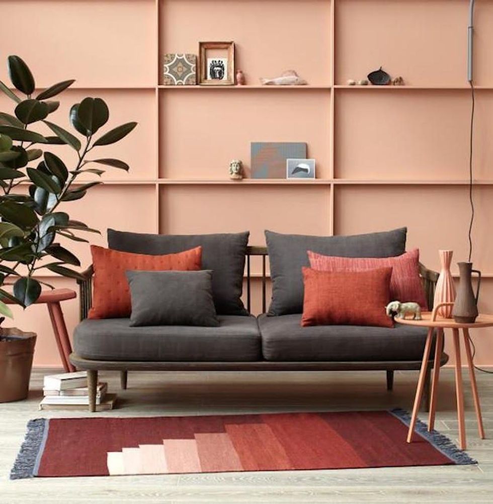 11. Beachy Mauve: Take an elegant mauve couch to that Far-Fetched place with a bright, exotic-print area rug. Then blend it together with mod, geometric pillows. (via Light Lab)