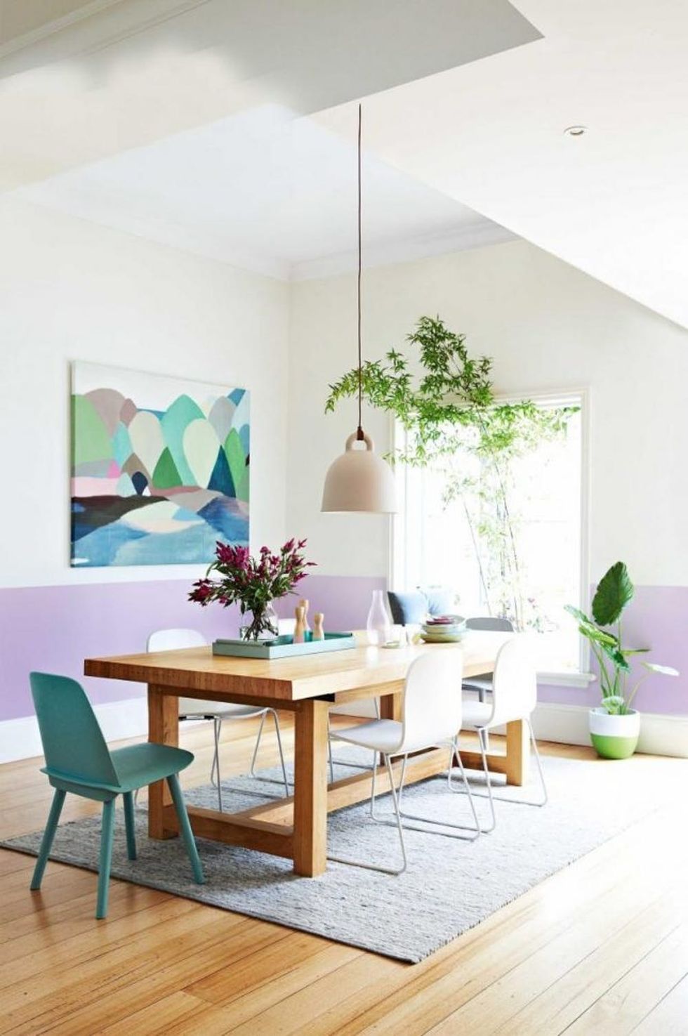 2. Half and Half: A bold, half lilac wall will ensure that your dining room of clean lines and solids is far from dull. Complement with some greenery and pops of blue for the prettiest room ever. (via Inside Out)