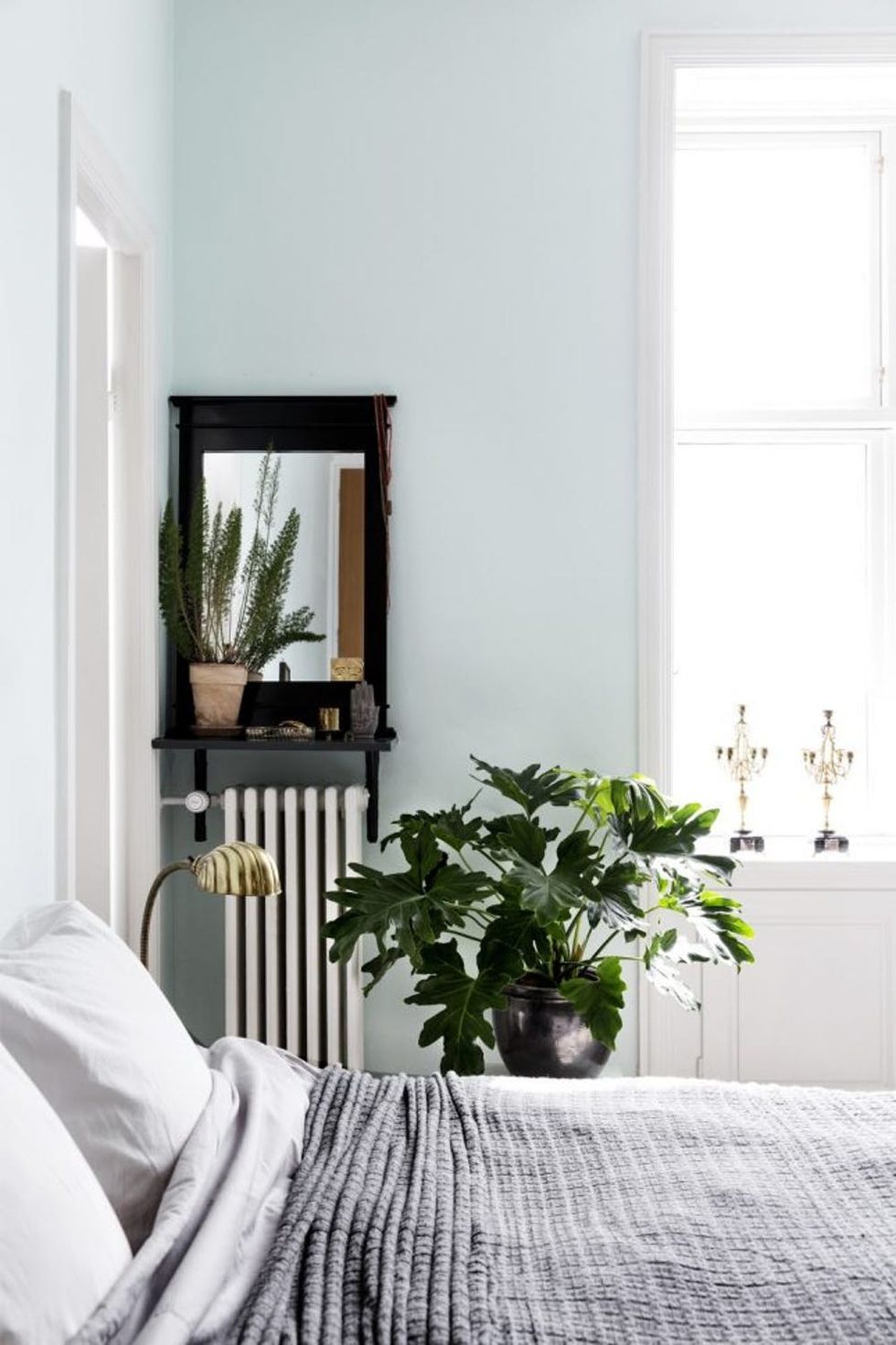7. Dark, Muted Greenery: Don’t be afraid to go dark on your walls with a deep shade like the dreamy green-blue pictured above. The trick is to fill the room with soft pieces — like flowy green curtains and pastel accents — to keep things light and airy. (via Line Klein)