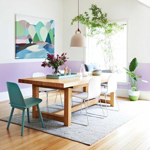 2. Half and Half: A bold, half lilac wall will ensure that your dining room of clean lines and solids is far from dull. Complement with some greenery and pops of blue for the prettiest room ever. (via Inside Out)