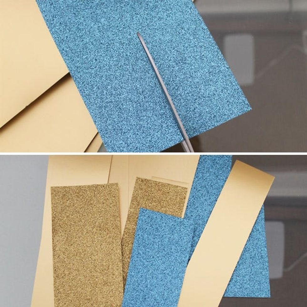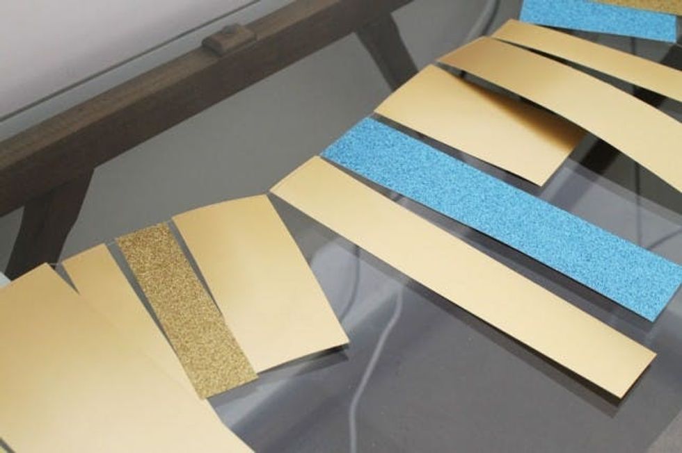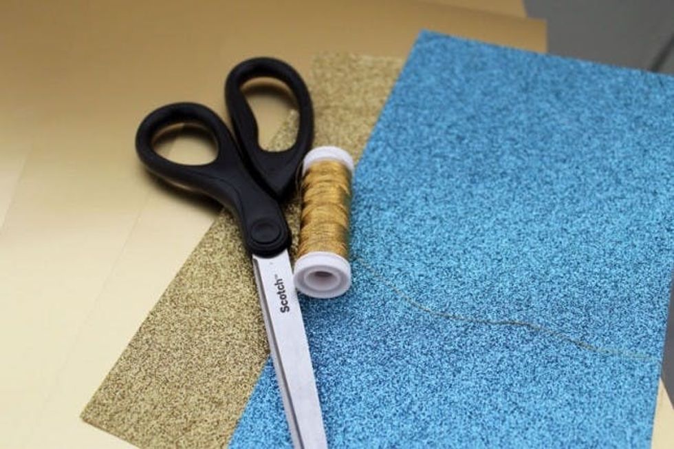 First, get your materials together. We used gold and blue paper with a bit of sparkle, but you can use pretty much any time of paper you can find. Magazine covers can work, paper bags, etc. Anything that is slightly thicker than standard copy paper or magazine pages.