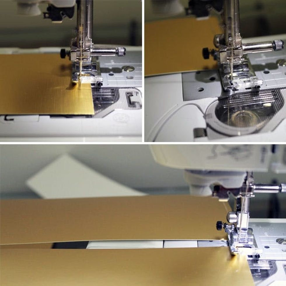 Then feed in your next piece of paper and repeat until you’re done! (Note: If you don’t have a sewing machine, you can also achieve a similar look by stapling pieces of paper to ribbon or thick twine.)