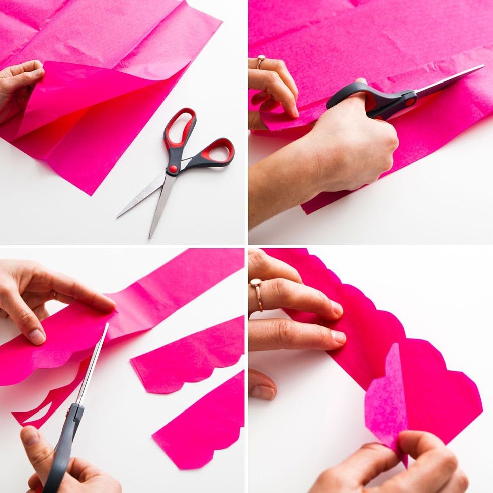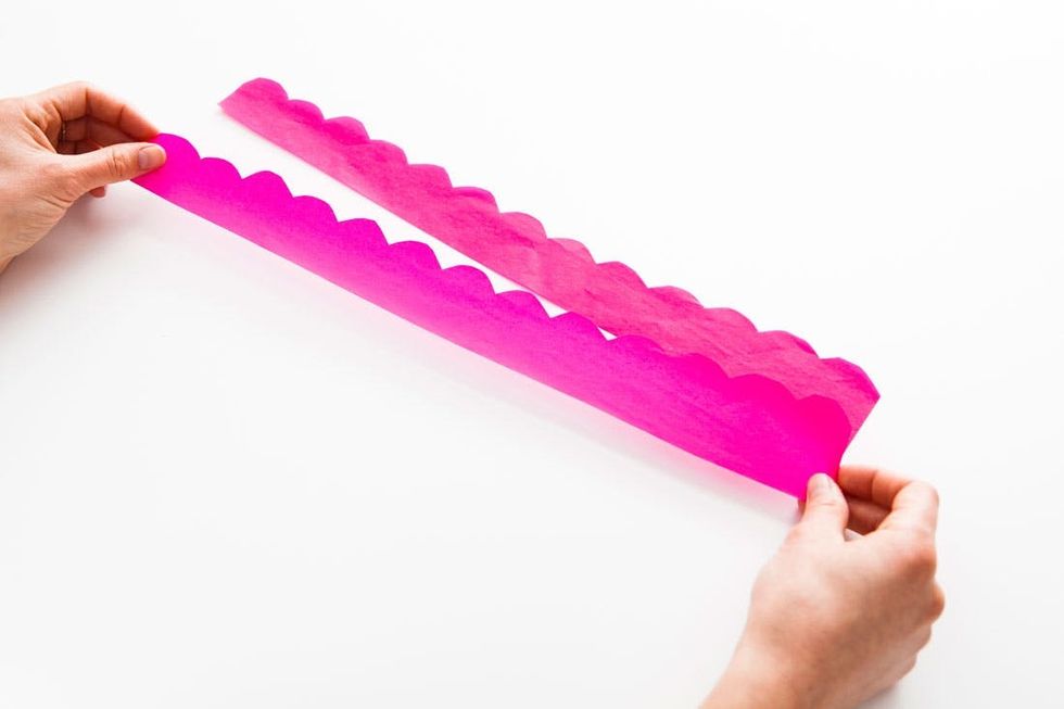 First, choose a color and layer up two pieces of tissue paper on top of each other. Then, cut a strip including both sheets. Ours were 12 to 16 inches long and 1 to 2 inches wide. On one side of each strip, cut arches or scallops to create petals.