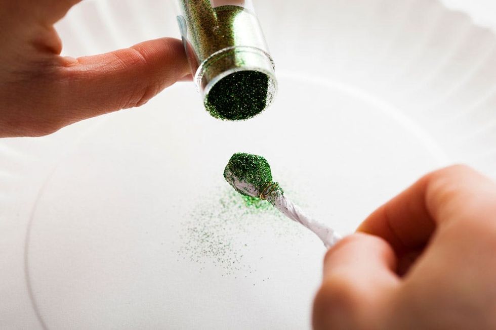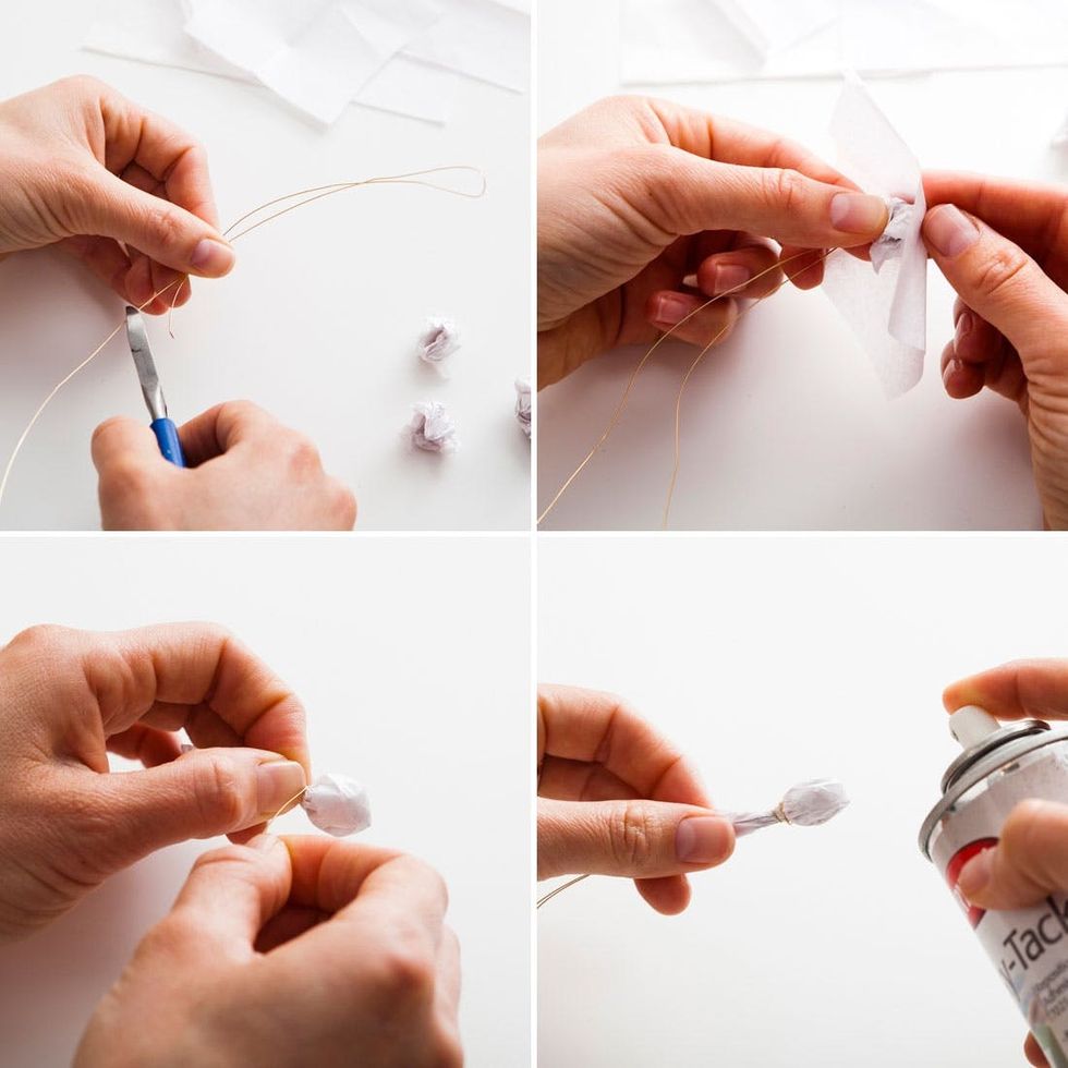Now it’s time to create the sparkly stigma, also known as the center of the flower. Fold a piece of wire in half and cut to the length you’d like your stem to be. Next, use white tissue paper and cut out two squares for each stigma, approximately 3 x 3 inches. Crumple one square into a ball, and insert the folded end of the wire into this ball. Wrap the second square over the first, then secure with a small piece of wire. Then, take your newly crafted stigma and spray with spray adhesive.