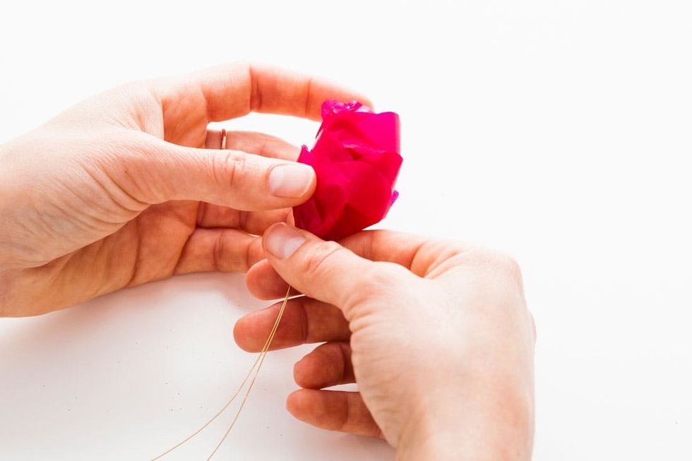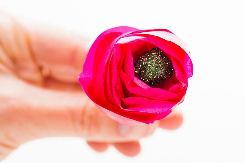 12. Roll the tissue paper around the stem, pinching at the bottom and slightly flaring the top out.