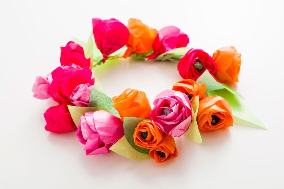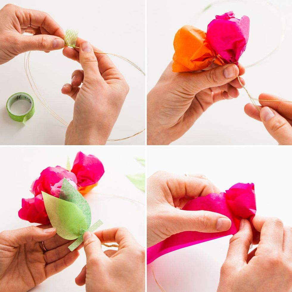 Measure your head and cut the wire so that it’s double thick. Secure with washi tape. Then wrap the wire stems around the wire crown. Add tissue paper leaves in between flowers, and keep going until you’re finished.