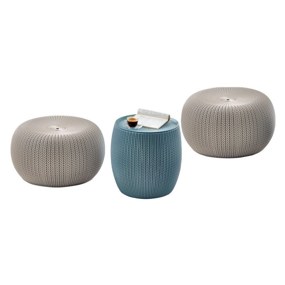 Urban Cozy Knit 3-Piece Outdoor Poufs and Table Set ($100): If a bistro set seems like a tight squeeze, this cozy and flexible pouf is a perfect alternative. Bonus: It gets gets even *smaller* for storage, with the bottoms of the beige poufs opening with space to conceal the teal table within.