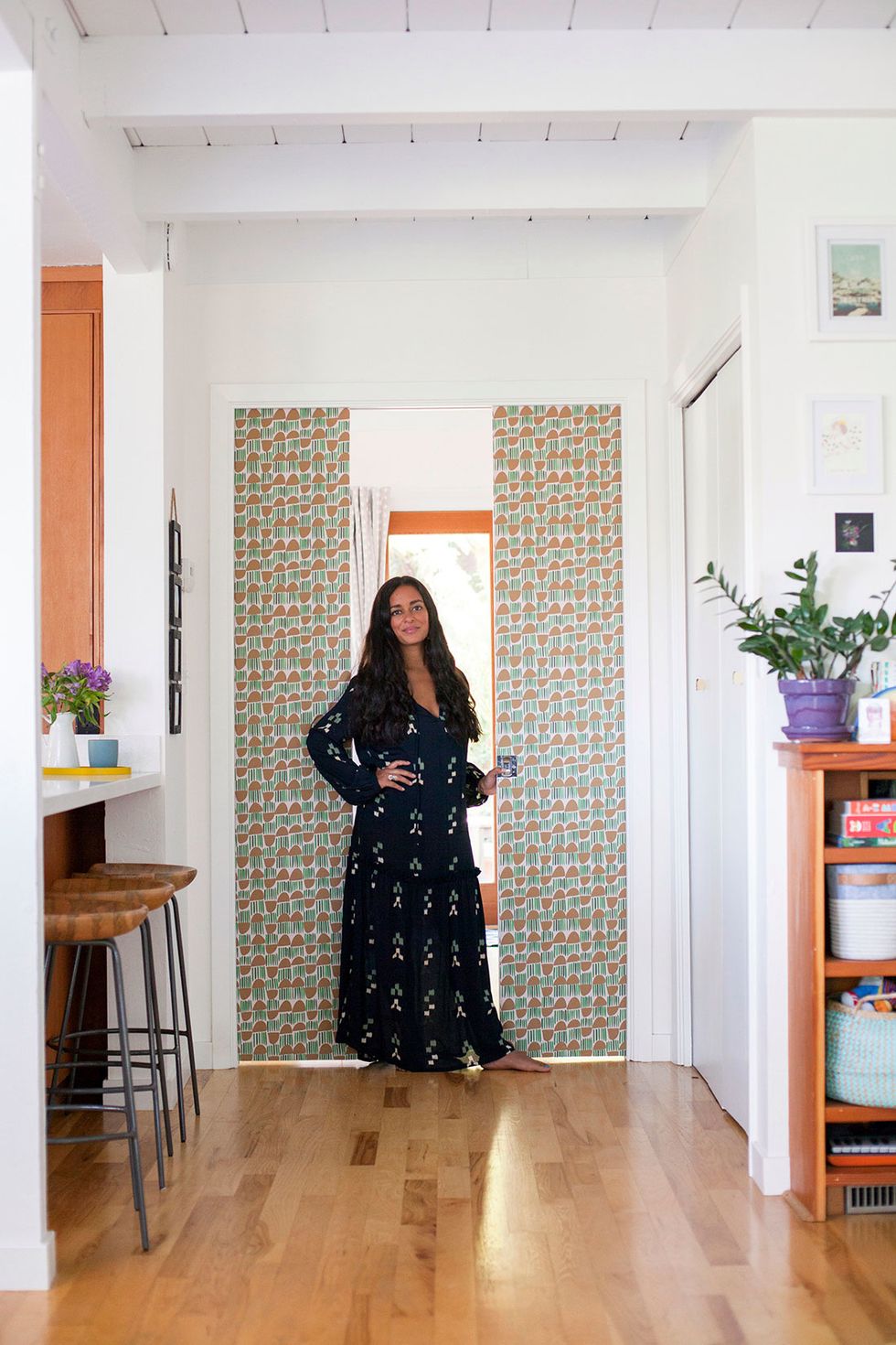 Anjelika Temple here, co-founder of Brit + Co and proud owner of several pocket doors! When I moved into my first real grown-up house a couple years ago, I knew I wanted to incorporate wallpaper so reached out to our friends at Chasing Paper to see how we might collaborate. It felt like a total lightbulb moment when I realized I could create a surprise pop of pattern on a couple sets of pocket doors.