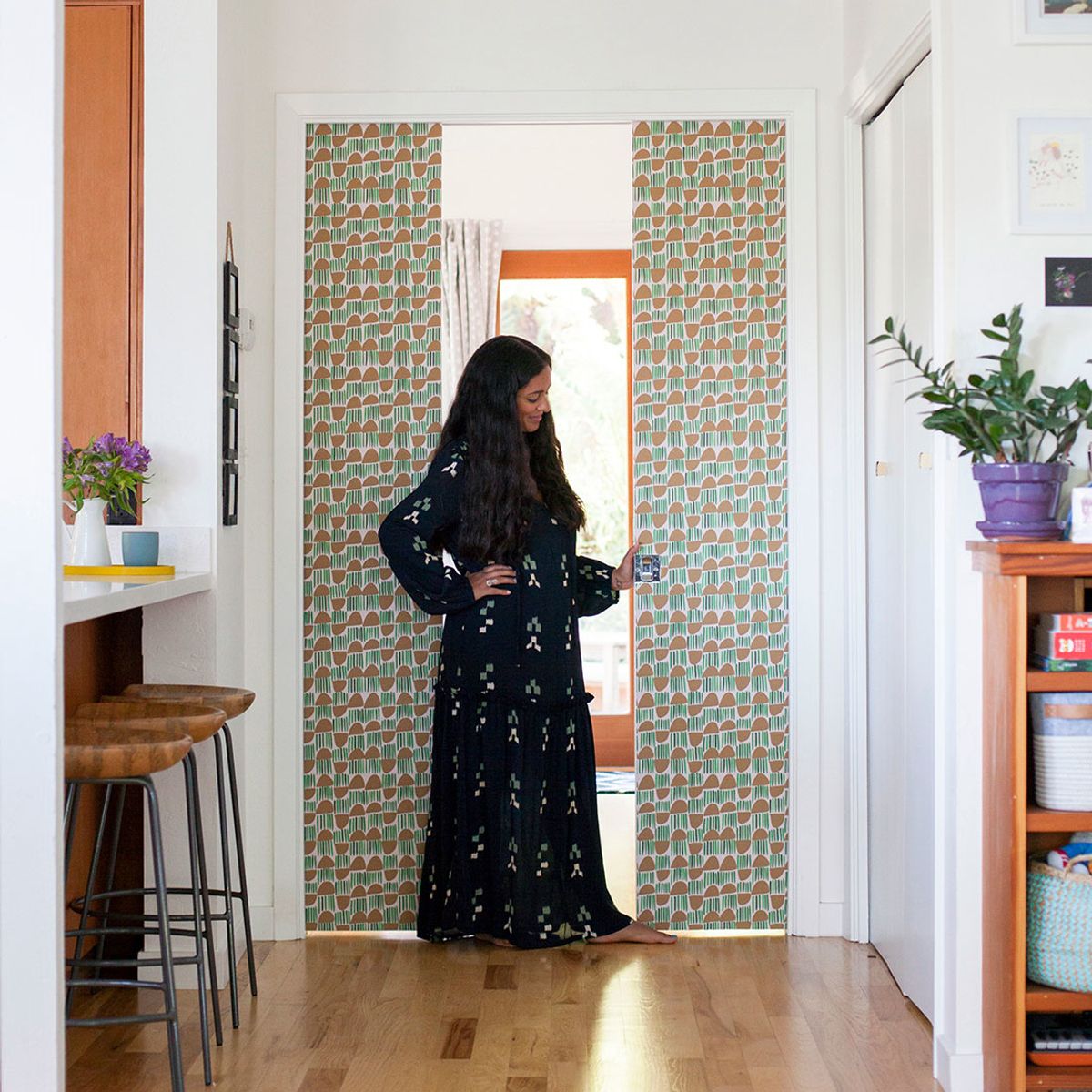 Anjelika Temple here, co-founder of Brit + Co and proud owner of several pocket doors! When I moved into my first real grown-up house a couple years ago, I knew I wanted to incorporate wallpaper so reached out to our friends at Chasing Paper to see how we might collaborate. It felt like a total lightbulb moment when I realized I could create a surprise pop of pattern on a couple sets of pocket doors.