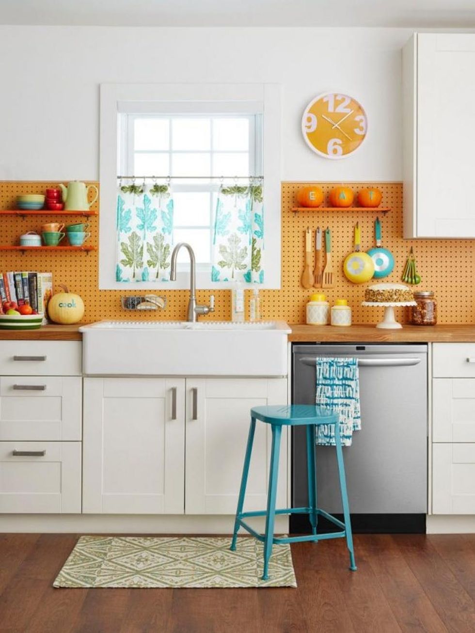 2. Kitchen Helper: Subway tile might be haute, but it sure won’t give you the storage that a pegboard backsplash will. Use movable, mini-shelves for spices, accents, and coffee mugs. (via HGTV)