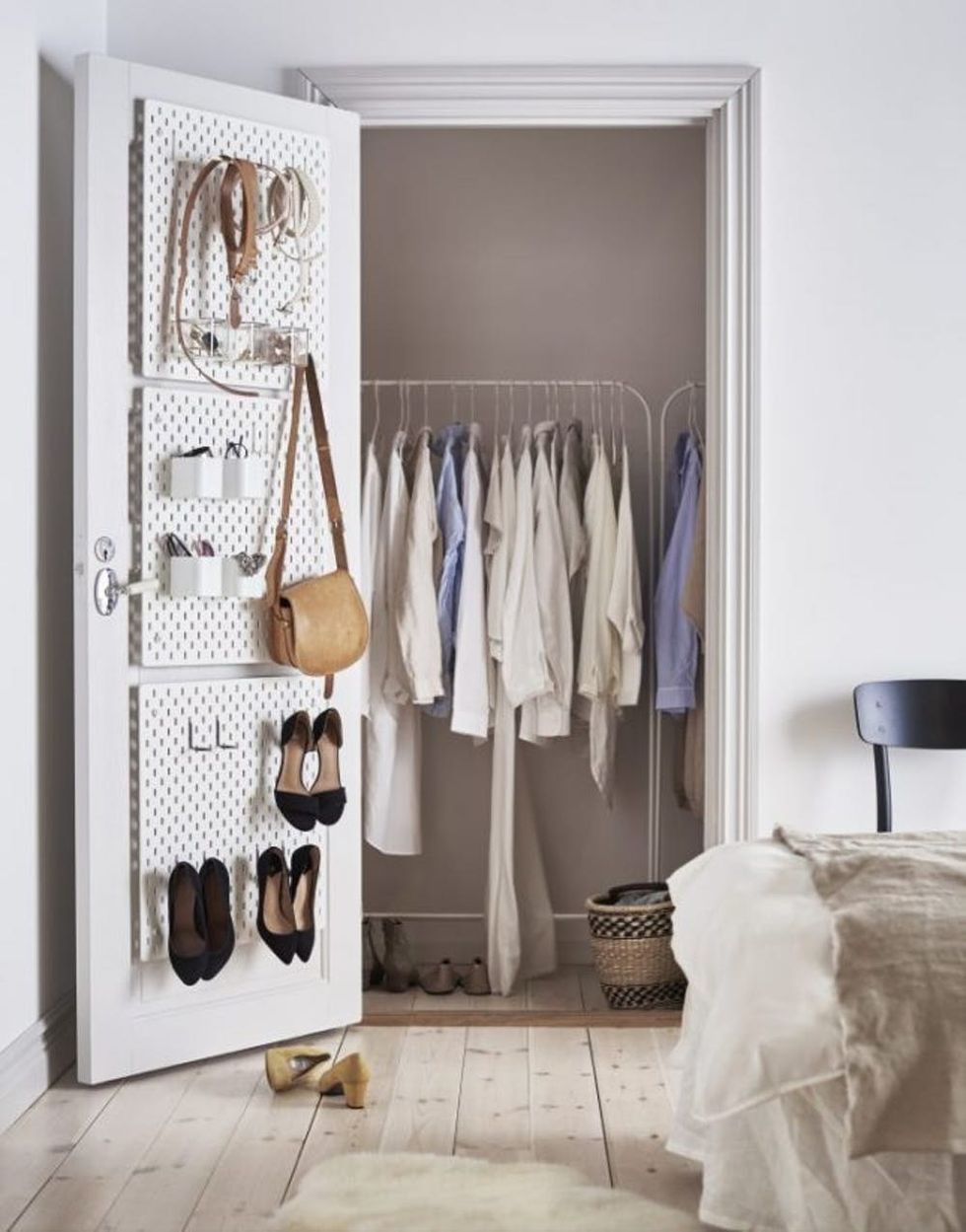 7. Closet Surprise: Since pegboards are flat you can fit them almost anywhere, including the back of a closet door. Attach small pieces directly to the door for extra stability, or attach hooks to the top of one long board for an easy installation. (via IKEA)