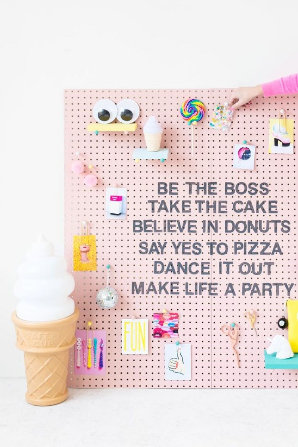 9. Inspirational Art: Take that pegboard to the next level by using a funky piece of inspirational art in your workspace. Paint it cotton candy pink, arrange a collection of knick-knacks and essentials around the edge, and then top it off with a quote. (via Studio DIY)