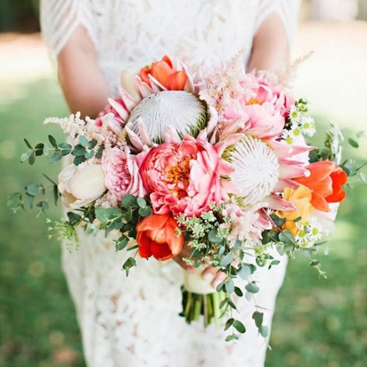 King protea, meet peony. The varying textures in this bouquet will really show in your photographs and keep things unique. (Photo via Julie Harmsen Photography / Ruffled)