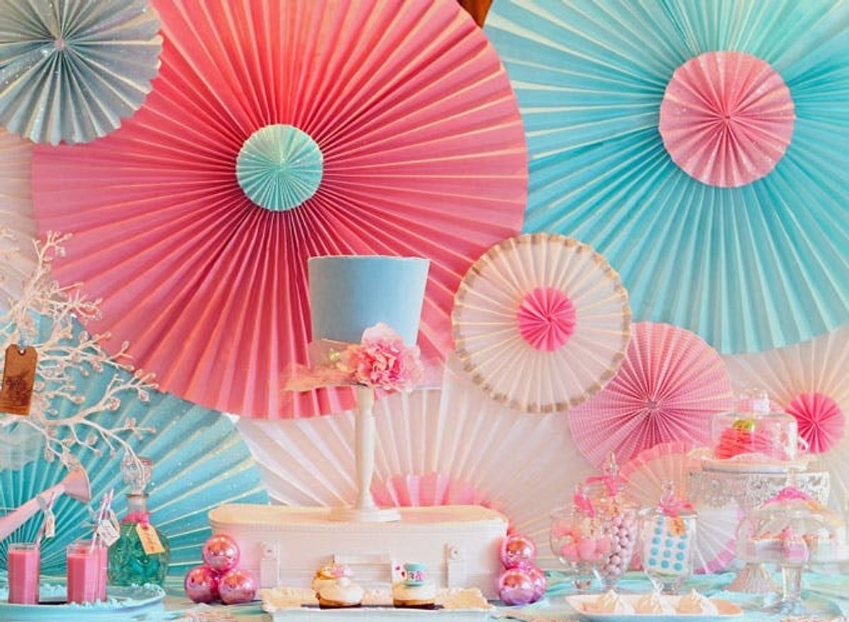 Rosette backdrops brighten up any party, and we love the mix of aqua and pink behind this delicious dessert table. (via Design Dazzle)