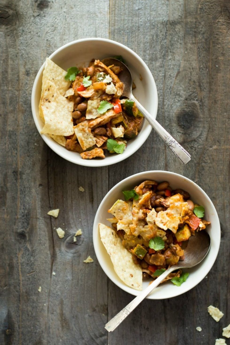 5. Chicken Chili Casserole: A spicy blend of veggies, enchilada sauce, and chicken make up this casserole. But the sprinkle of tortilla chips and cheese on top are what will keep you going back for more. (via Healthy Nibbles and Bits)