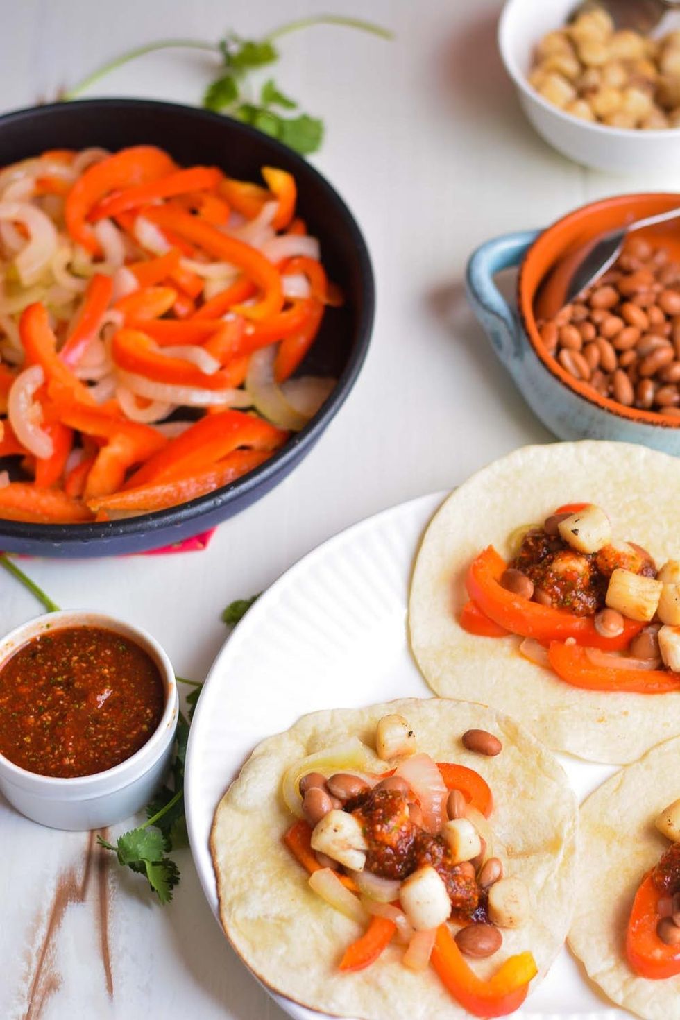 7. Scallop and Pinto Bean Fajitas: Sweet, juicy scallops are a fun swap for the usual chicken or beef in your fajitas. They’re paired with pintos, veggies, and a roasted red pepper sauce. (via A Taste of Joy and Love)