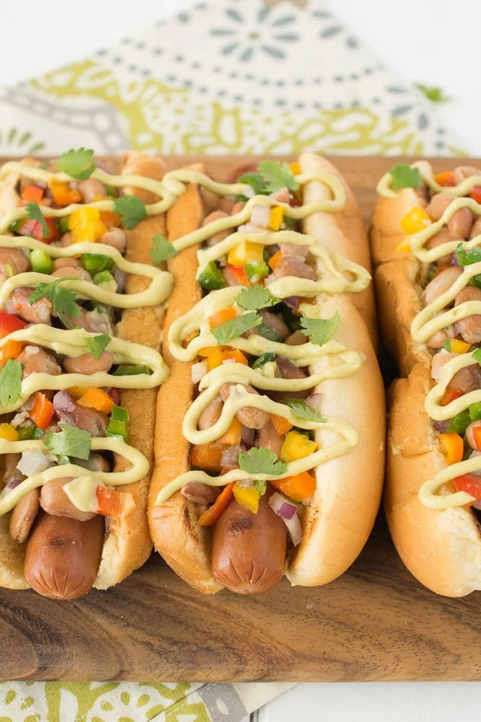 9. Mexico-Inspired Hot Dogs: Hot dogs (and veggie dogs) are a simple choice for weeknight dinners. Top them with a colorful pinto bean and sweet pepper salsa and a drizzle of avocado crema for good measure. (via Culinary Ginger)