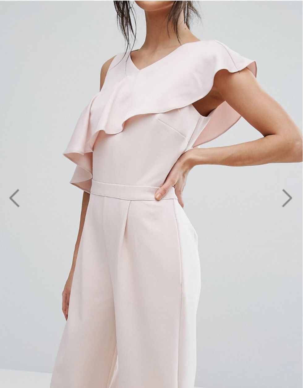 Dressed in a Warehouse Ruffle One Shoulder Jumpsuit from ASOS ($123), Middleton’s paired her pale pink culotte ruffled-top one-piece with an oversized heart-shaped clutch and red shoes to match. The 33-year-old kept her hair and makeup simple, accentuating her freshly tanned skin with tousled hair.