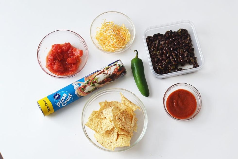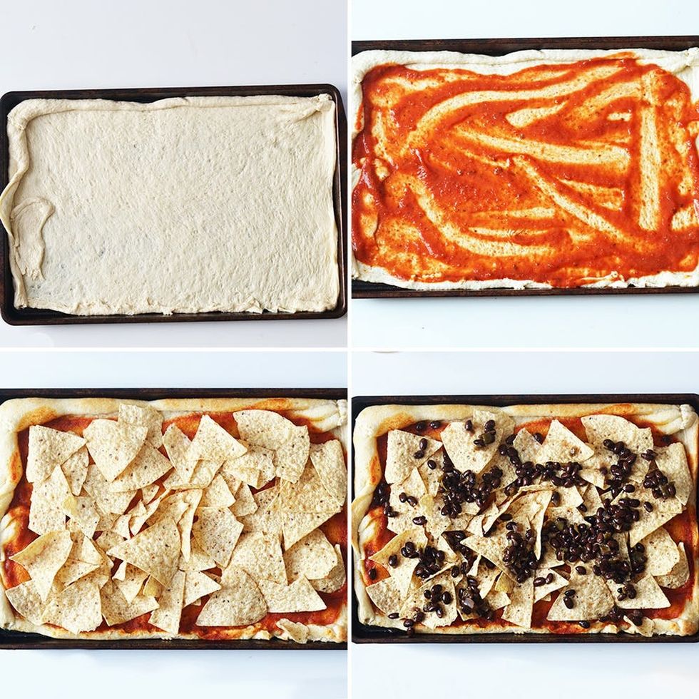 Roll out dough on a nonstick cookie sheet. Add a small amount of pizza sauce on the dough and lightly spread it around. Place in the oven for seven minutes at 425 degrees Fahrenheit. When the dough has cooked, take the pan out and turn on the broil to preheat. Sprinkle tortillas all over the pizza. Add black beans.