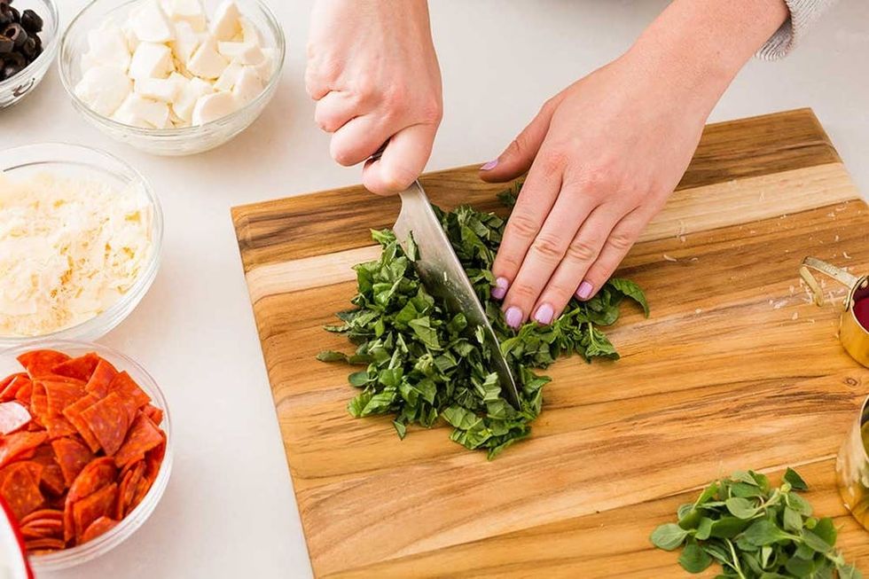 1. Place cooked bowtie pasta in a large bowl. Cut pepperoni pieces into quarters and set aside. Mince garlic cloves. Chop basil and oregano. Add minced garlic and chopped herbs to pasta.