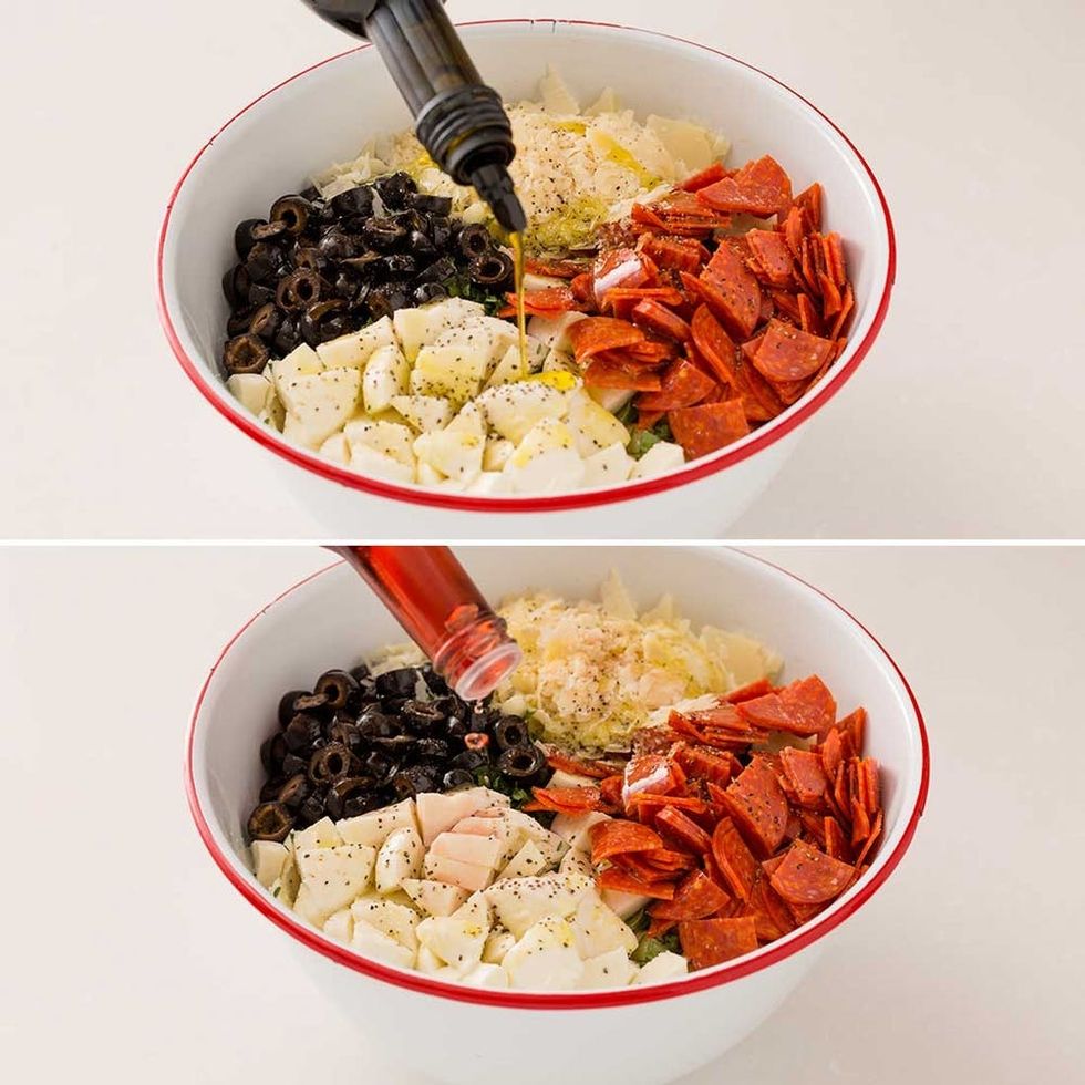 Add pepperoni pieces, olives, mozzarella, Parmesan, and salt and pepper to the bowl. Drizzle with olive oil and red wine vinegar.